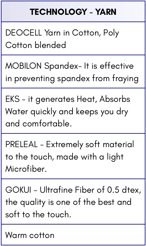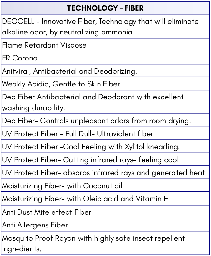 We offer a wide range of RW and dyed yarns: polyester filament, nylon, polycotton yarn, acrylic yarn, indigo, and a full range of Venus brand cotton yarns, along with BCI, organic, GRS recycled yarn, PSCP yarn, and advanced technology textiles for applications such as anti-wrinkle, deodorization, UV protection, electrostatic water repellency, quickdrying, washability, and more.